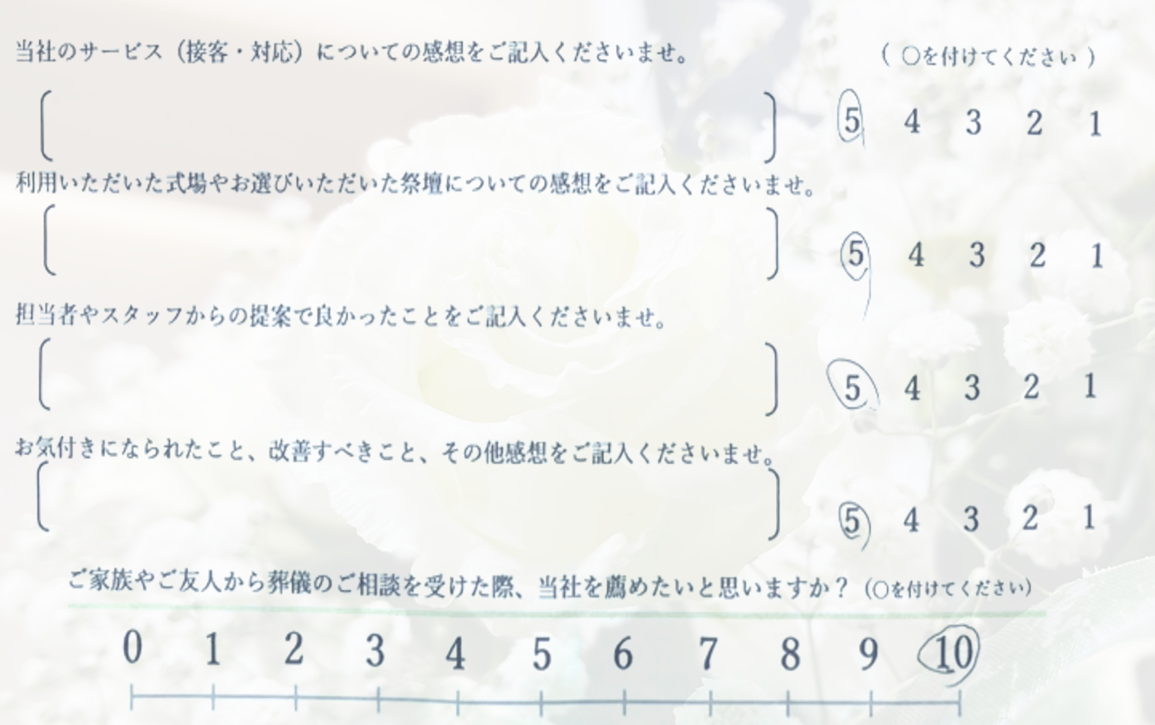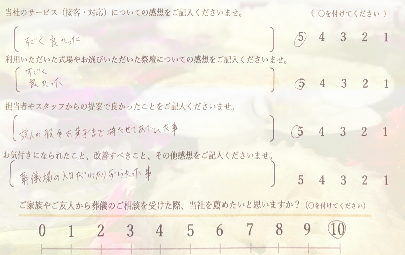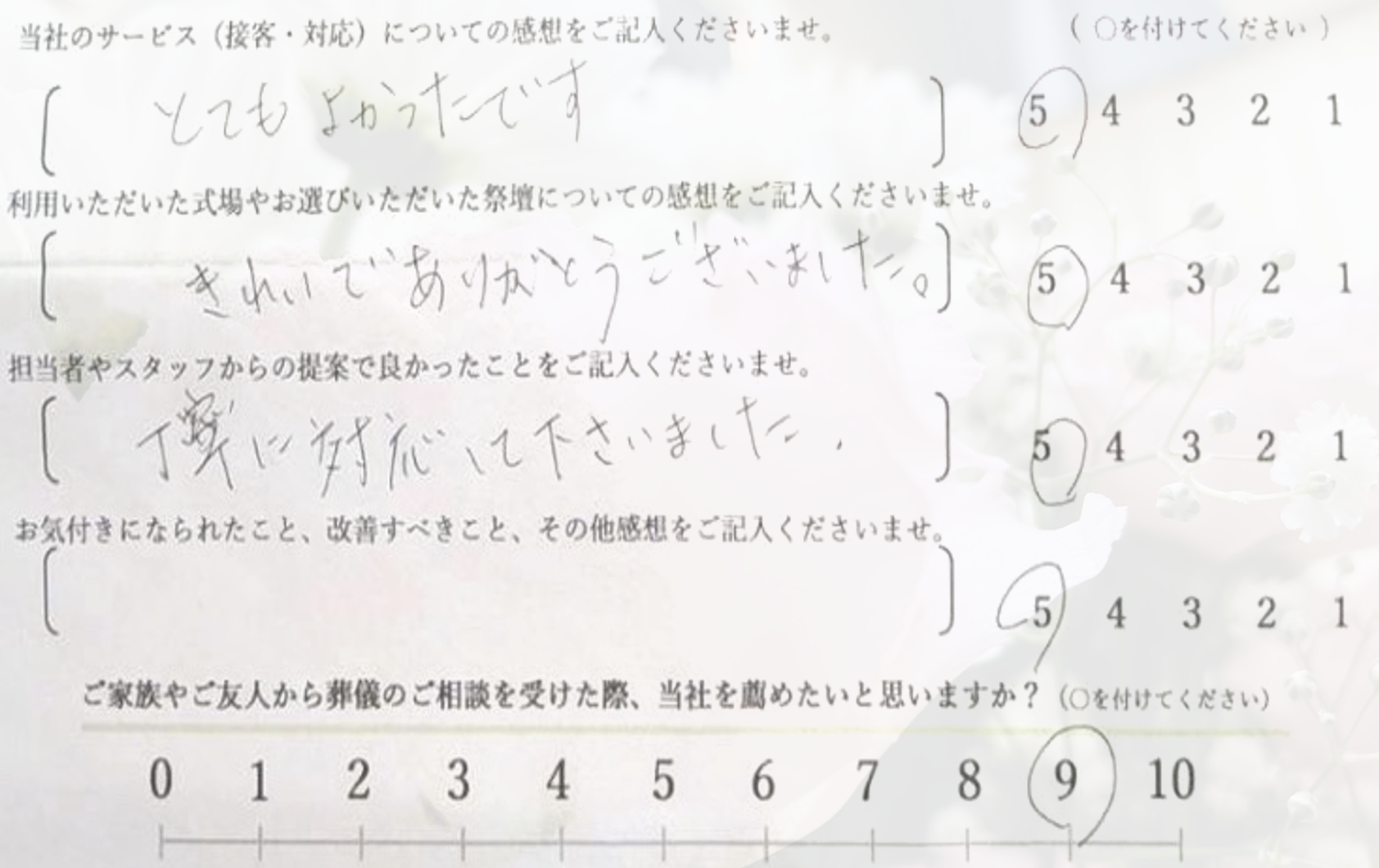 堺市立斎場で家族葬にてお見送りされたお客様のお声 Q:弊社のサービス(接客・対応)について感想をご記入くださいませ。 評価:5 -