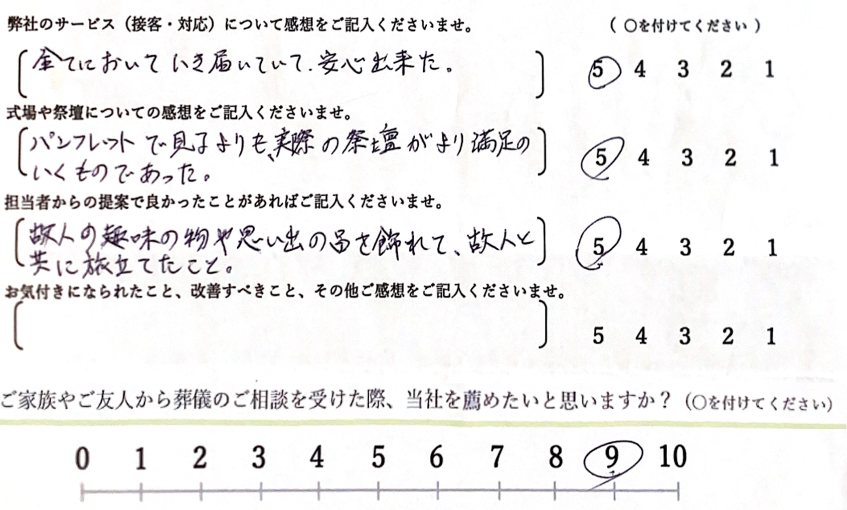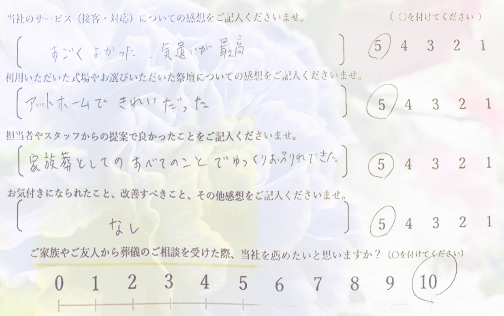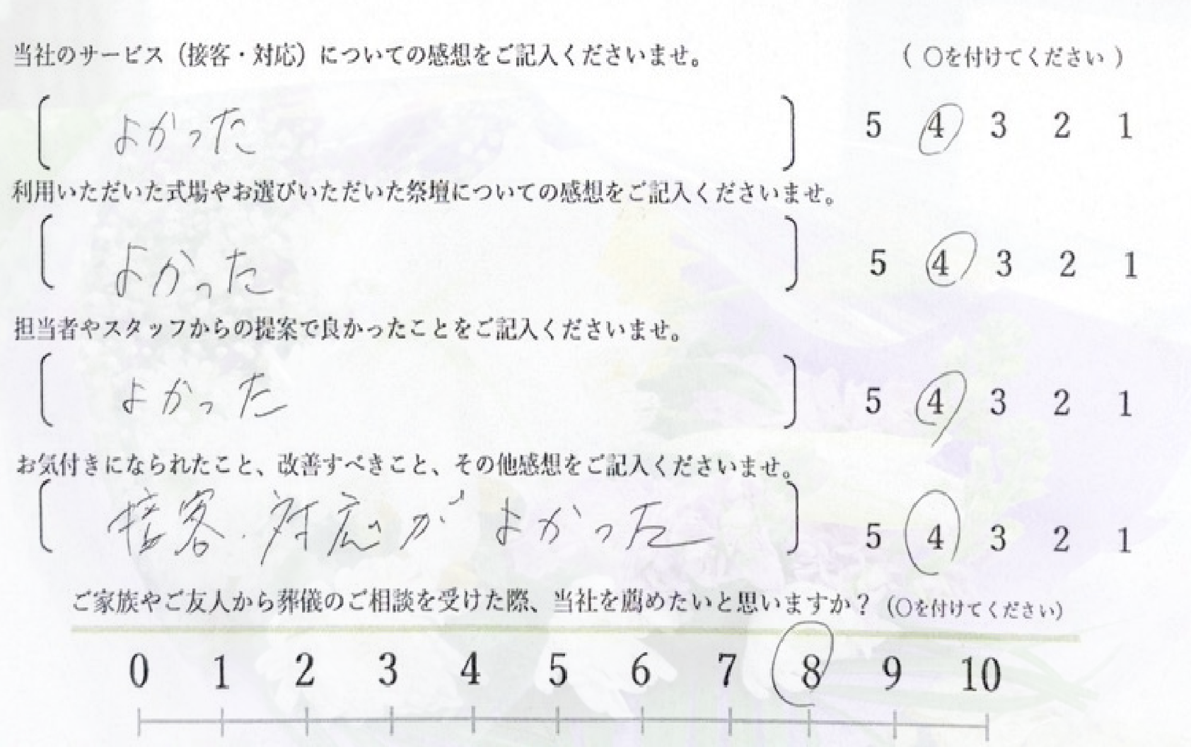 堺市立斎場で通夜・葬儀を家族葬にてお見送りされましたお客様のお声 Q:当社のサービス(接客・対応)についての感想をご記入くださいませ。 -