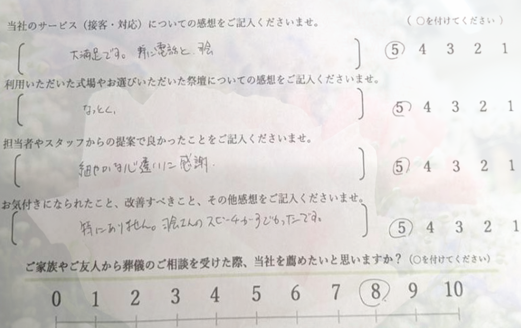 堺市立斎場で直葬にてお見送りされたお客様のお声 Q:当社のサービス(接客・対応)についての感想をご記入くださいませ。 評価:5